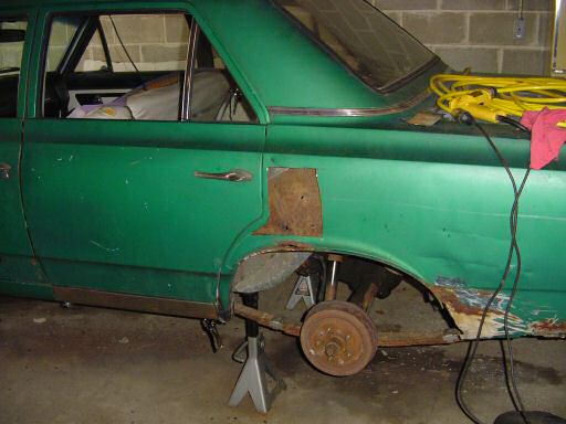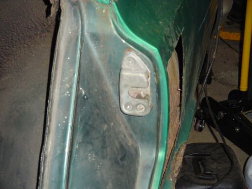 As you can see from the chalk line, this is a few inches higher than I originally planned to cut but it will actually be okay since the wheel house is rusted worse than I guessed originally. I also found a hole (it's the dark spot in the middle of the area I cut out) that looks suspiciously like the end of a Philips head screw driver made it so I suppose I'm not the only one to have a bad day working in this area of the car. Anyway, here's what it looks like where this plate is supposed to live: