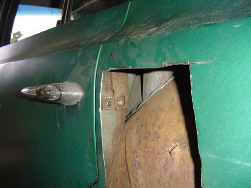 Where I ran into problems was after the screws were out. Immediately after removing the last screw, the L shaped plate they screw into dropped out of position. On a two door car, there's enough room to put the plate back in place but not on a 4 door or a wagon! The only way to gain access to this area of the car is to start cuttin'. So cut is what I did and I ended up making a hole this big: