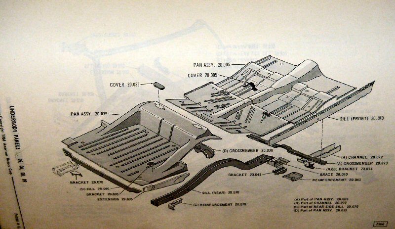 Back to American Restoration Index Floor And Rocker Panel StuffThis is an exploded view of a 1966-69 American floor pan (except convertible)