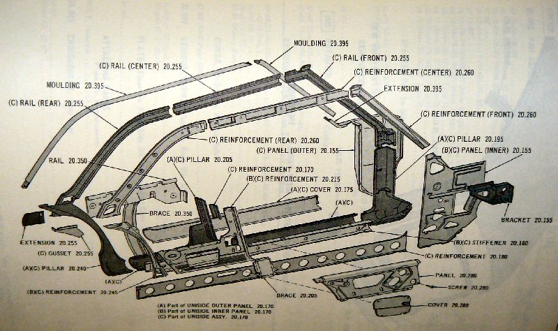 This is an exploded view of a 1966-69 American hard top "uniside". This diagram is for 2 door hardtops.