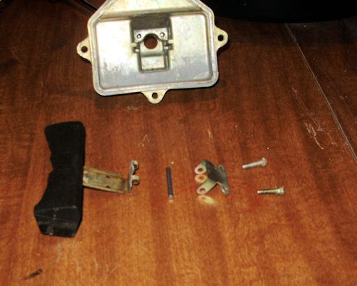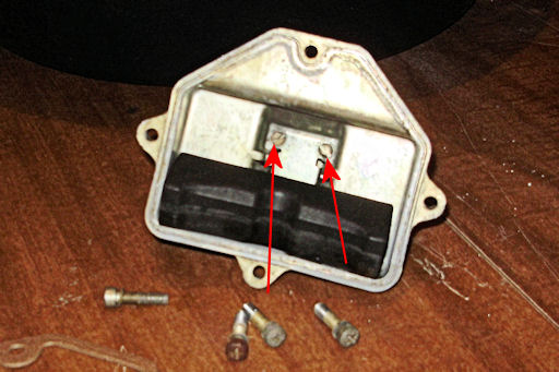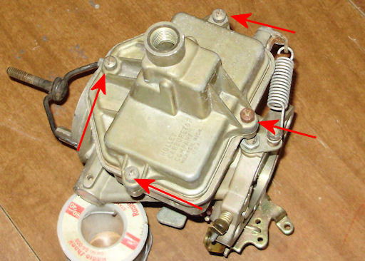 Note: If it has been a long time since the last rebuild, these screws can be very difficult to remove. Make sure your screw driver is in good shape before starting and take your time. If needed, you can spray some penetrating oil on them from the main body side. Once the screws are out, remove the fuel bowl cover. It will probably be hard to remove but resist the temptation to pry between the main body and screw bosses in the cover. Doing so will likely warp the cover resulting in a major fuel leak. Tapping on the cover with a plastic hammer (or the handle of a heavy screw driver) will break the cover loose without warping it. Remove the gasket and place it in your discard pile. Use the 3/16" flat blade screw driver to remove the float retainer screws from the cover (red arrows point to screws).