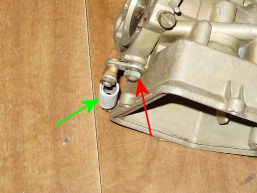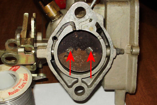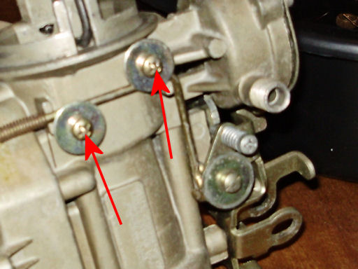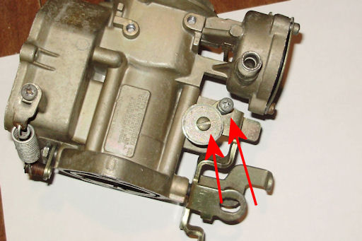 Remove the curb and fast idle adjusting screws (red arrows) and springs. The flat head screw is for curb idle and the #2 Philips head screw is for the fast idle.
