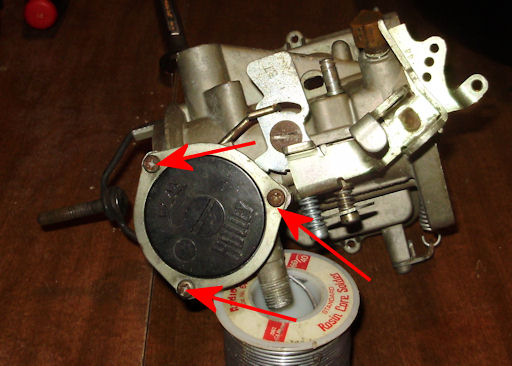 Using a #2 Philips screw driver, remove the 3 screws (red arrows) from the choke thermostat cover. Remove the choke thermostat and gasket. Note: The retainer is not a flat piece of metal so no