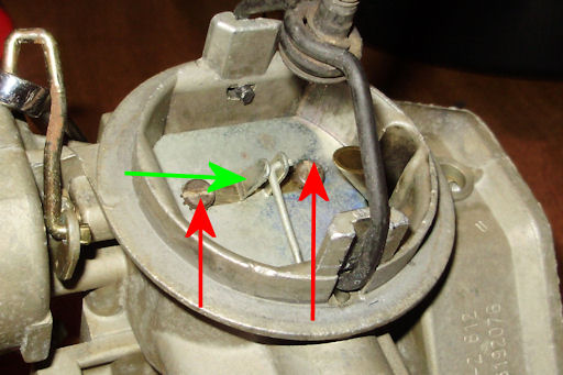 Using a #2 Philips screw driver, remove the screws (red arrows) holding the bowl vent rod to the carburetor. Remove the rubber valve from the end of the rod and place in the discard pile.