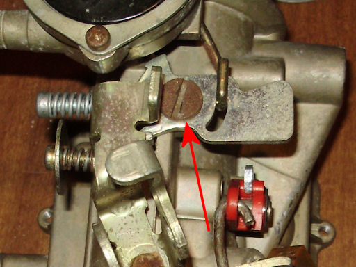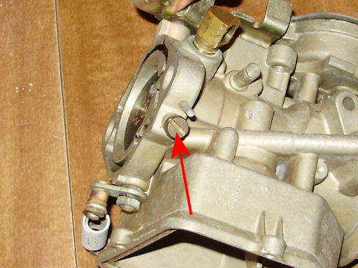 Back to American Restoration Index Holley Model 1931 RebuildCarburetor Disassembly (cont.)Using the 3/8" flat head screw driver, remove the screw holding the fast idle cam (red arrow) to the carburetor body and remove the fast idle cam.
