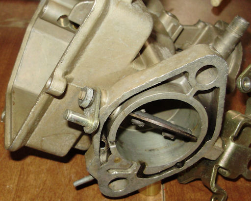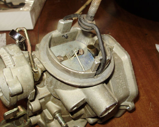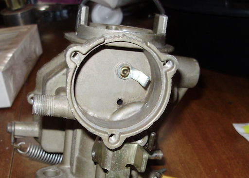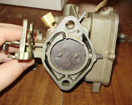 Install the choke plate following the same procedure used for the throttle plate. Put the end of the choke piston link on the hole in the tab and bend the second tab over to keep it in place. It should look like the picture below when complete.
