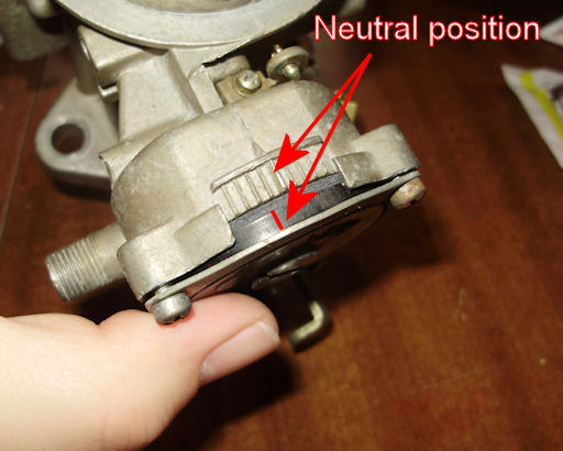 Check your TSM for the specifications for the choke thermostat. The big hash mark is the neutral mark for the thermostat. There is a mark on the thermostat that you use to adjust the choke richer (to the left) or leaner (to the right). The specification for Kermit is 1 notch rich. Tighten the retainer screws. Note: You may need to keep slight pressure on the thermostat to keep it in place until the screws are tightened.