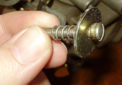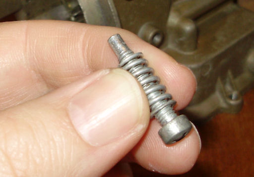 Install the curb and fast idle screws into the throttle lever. This is the curb idle screw. Note: This picture shows the wrong spring. The spring shown is actually for the fuel mixture screw. The correct spring is the heavier, brass colored spring.