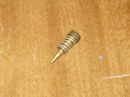 Install the spring on the fuel mixture screw and install the screw in the carburetor. Lightly seat the screw using your fingers to tighten it and then turn the screw one turn to the left. Note: The spring shown below is the wrong spring for the fuel mixture screw. This spring should be the lighter weight spring.