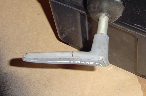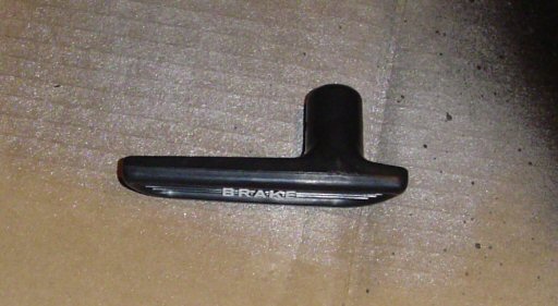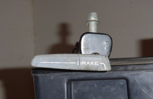 That's it for now. In a few weeks, I'll have this installed (and the front parking brake cable replaced) and I'll update this page after that happens. December 5 Update Okay, it's been more than a few weeks but I do have the handle installed. Instead of re-drilling the attaching pin hole in the new handle, we ended up drilling a new hole in the shaft itself. It ends up being drilled at 90 degrees to the original and a little further back on the shaft. Here's what it looks like when it's installed.