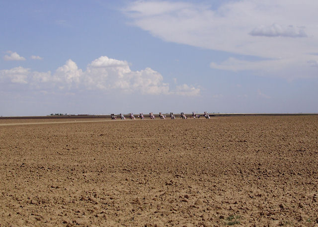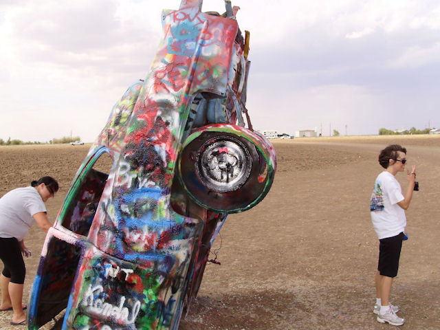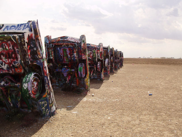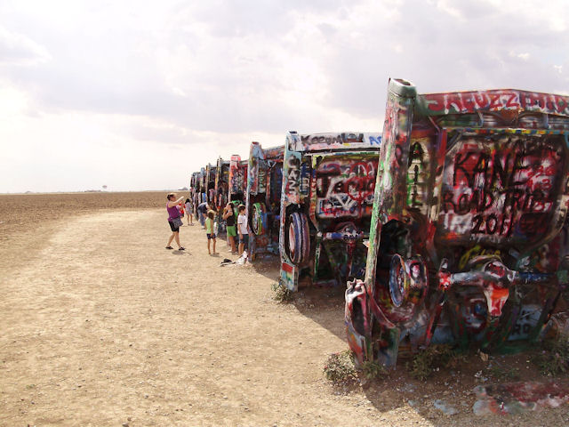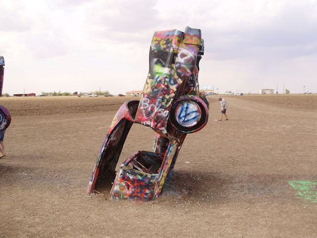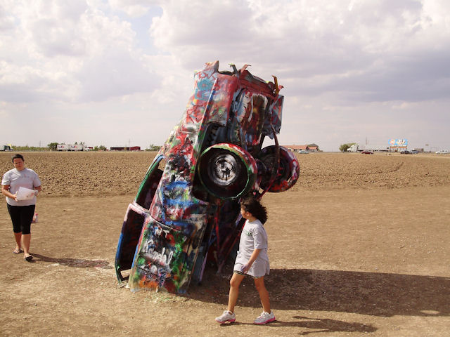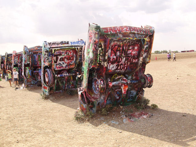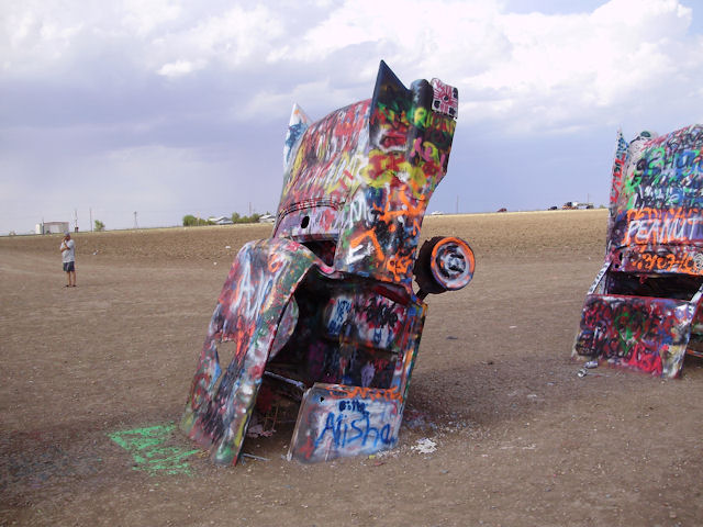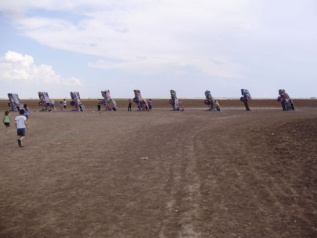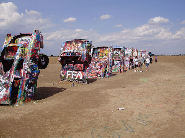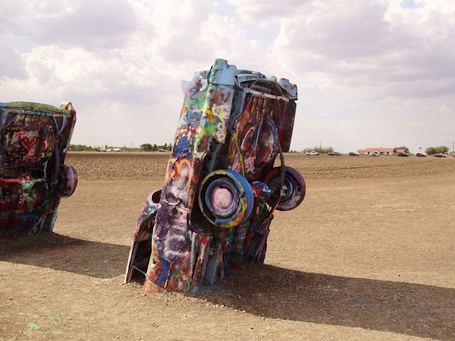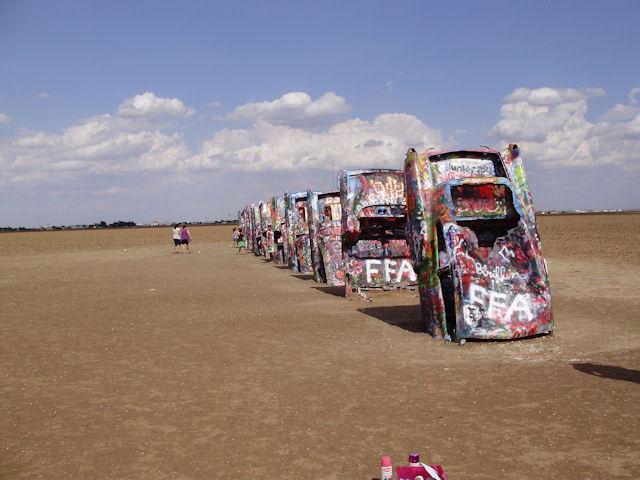 Cadillac Ranch (Near Amarillo, TX)The Cadillac Ranch is 10 Cadillac's made between 1949 and 1963 have buried in the ground (nose first) and set at the same angle as the side of the Great Pyramid at Giza. You can find directions to it at RoadsideAmerica.com (BTW, if you enjoy seeing oddball stuff, this is a great site to visit). This was something I've heard about but had never seen in person. I wanted to see it the last time I was in Amarillo four years ago but the timing just didn't work out then. This year, I got a chance to go and it was pretty neat to see. One word of warning if you decide to go: Graffiti is encouraged on these cars and there were several people actively painting while we were there. If the smell of spray paint bothers you a lot, this may not be the place to go. Also, make sure you stay up wind from the people painting.
