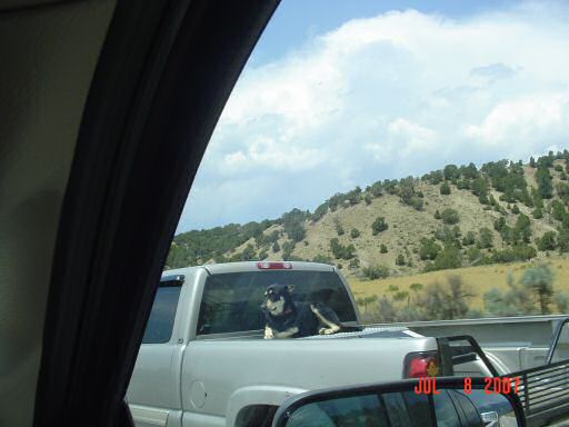Here's a dog hanging out in the back of a truck. Its seen here laying down but it was walking all over the bed and on the tool box and even had it's head up above the roof for a few minutes.
