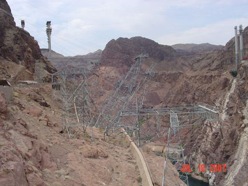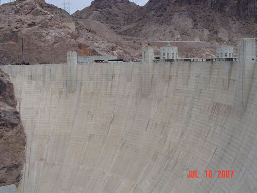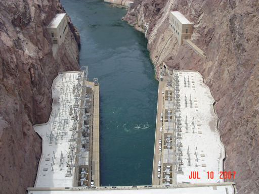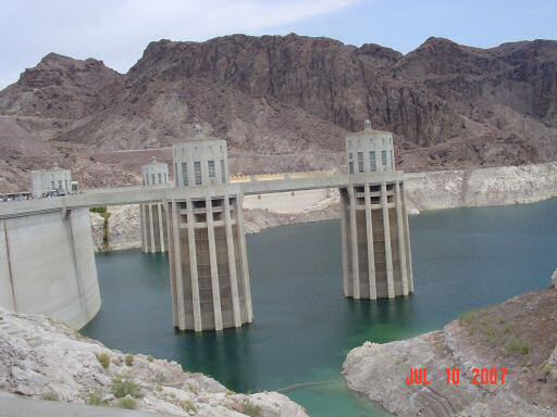 Hoover DamAfter spending a night in Los Vegas, the next stop was at Hoover Dam. Driving over the top of it wasn't very impressive. To one side, you have Lake Mead (one of the largest man made lakes) and the other side is the Colorado River. The height of the dam isn't at all obvious (especially when driving -- there is a lot of foot traffic) when you cross in a car but once you get out and start looking around, it's pretty obvious that it's pretty dam big (sorry about the pun, expect lots of them). This first picture is of the four inlet towers on the Lake Mead side of the dam.
