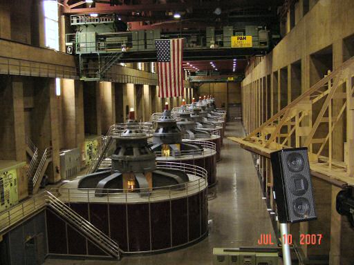 Here is the Nevada generator room. Each room holds eight generators. The big green thing at the top of the picture is one of two cranes used to service the generators. The other crane can be seen at the far end of the room.
